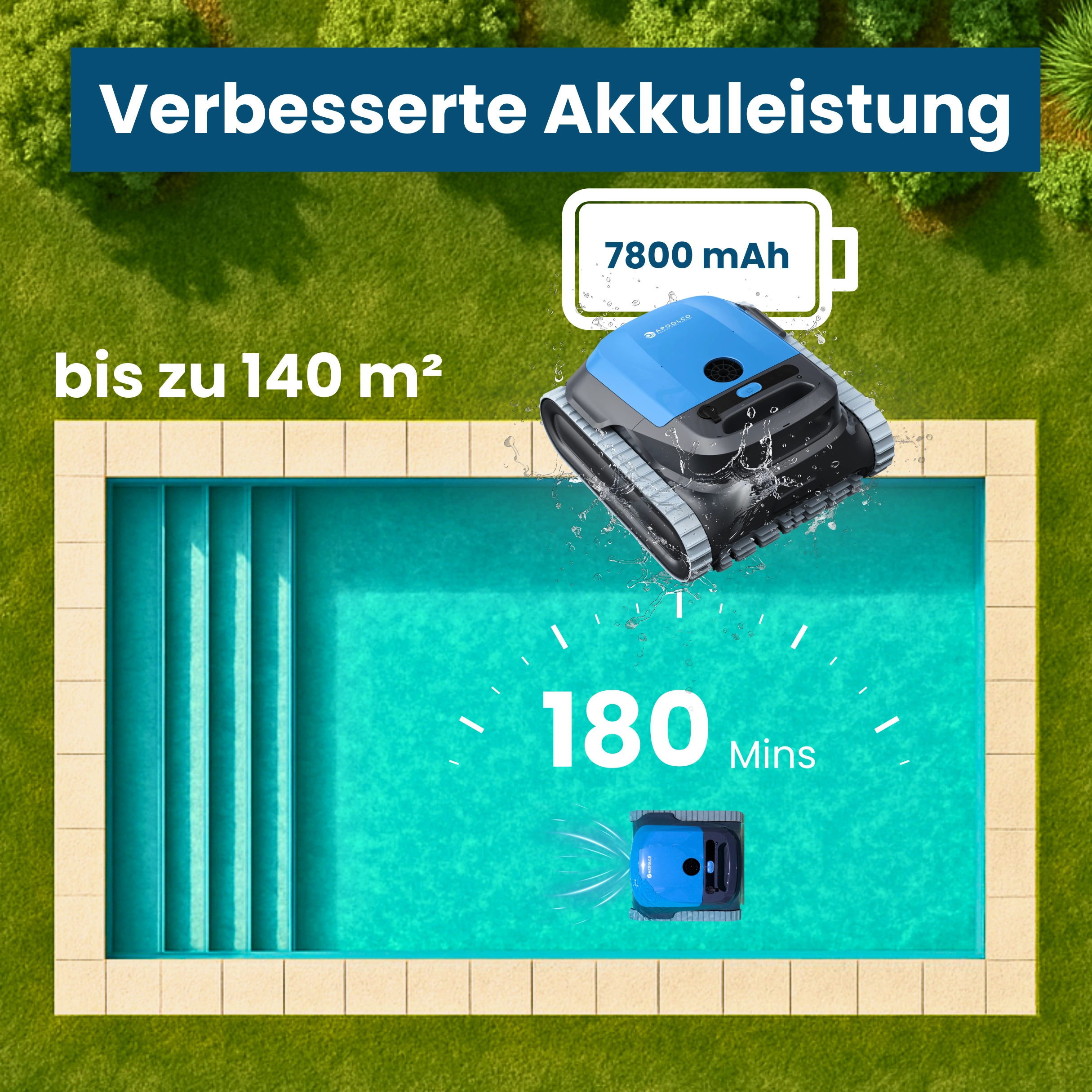 Der APEX #1 Akku-Poolroboter setzt neue Maßstäbe in der kabellosen Poolpflege. Mit beeindruckender Reinigungsleistung, intelligenter Navigation, App-Steuerung und einem besonders starken, im Servicecenter wechselbaren Akku bietet er alles, was moderne Poolbesitzer erwarten – und noch mehr. Entwickelt für Pools bis 12 m Länge oder 140 m² Fläche, reinigt er effizient und autonom – für kristallklares Wasser bei minimalem Aufwand.