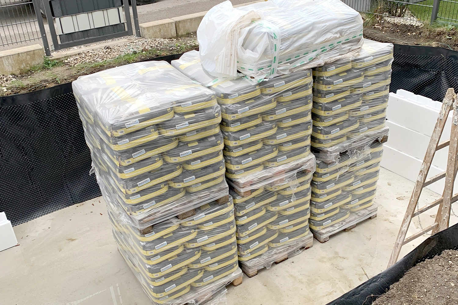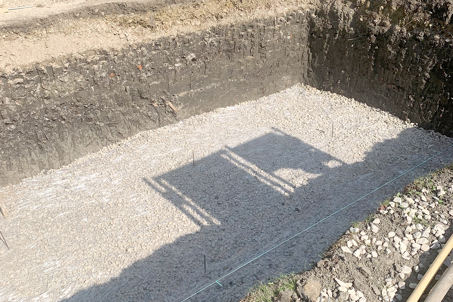 Aushub, Bodenplatte, Beton, Eisen, diverse Maschinen und Werkzeuge, Schotter, Fliesen.