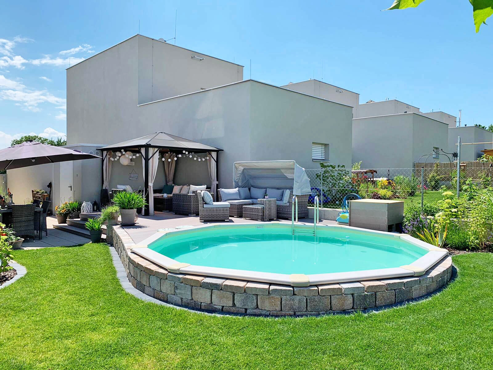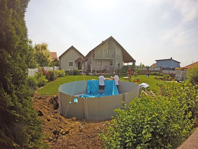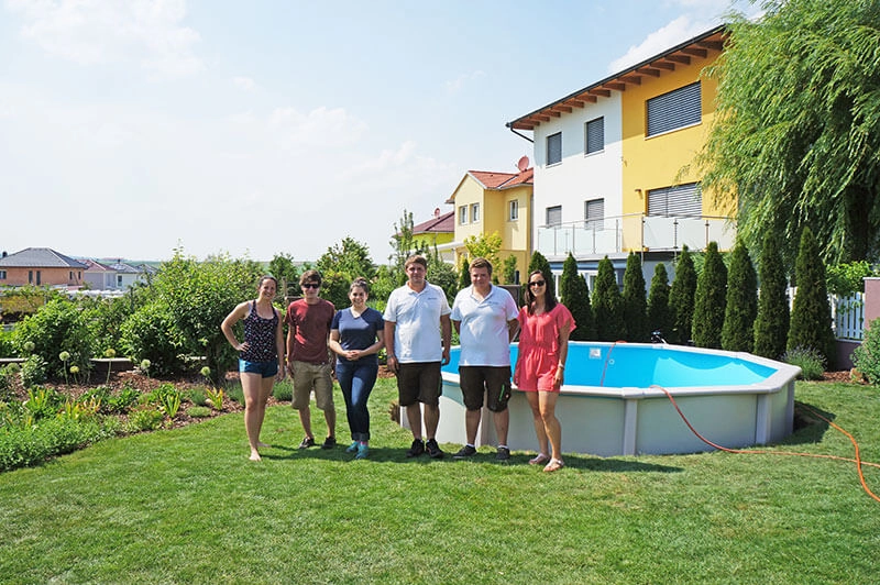 Beatrice und ihre Familie haben diesen Feeling Premium Pool im Frühjahr 2018 bei einem Apoolco Gewinnspiel gewonnen. Damals waren die Feeling Premium Pools neu im Programm und dank des stärkeren Handlaufs und robusteren Bauweise gleich im ersten Jahr ein wahrer Verkaufshit. Ein Teil unseres Teams ist im Mai 2018 mit Sack und Pack frühmorgens in Niederösterreich angerückt und hat den Pool aufgebaut. Wir bedanken uns nochmal bei Beatrice für die herzliche Gastfreundschaft, die köstliche Grillerei nach getaner Arbeit - und dass sie uns immer wieder mit tollen Bildern oder lustigen Videos mit den Kids im Pool versorgt! Wie aus den Fotos ersichtlich ist, wurde der Stahlwandpool original mit blauer Poolfolie aufgebaut, welche ein tiefblaues Poolwasser ergibt. Später wurde der Pool nochmal ab- und wieder neu aufgebaut - allerdings mit einer sandfarbenen Poolfolie, die das Wasser wiederum türkisgrün schimmern lässt. Kleiner Apoolco-Tipp: Bei einem Platzwechsel des Pools rechnen Sie eine neue Folie mitein, da es bei der alten Folie spätestens bei den Ausschnitten der Einbauteile Schwierigkeiten geben kann sie wieder genau an den Platz zu bekommen. Abgesehen von einem Platzwechsel können Sie Ihren Feeling Premium Stahlwandpool getrost draußen überwintern und müssen ihn nicht extra abbauen.