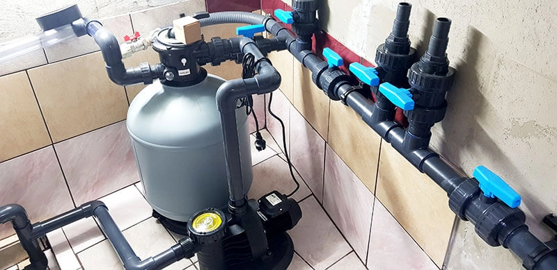 Die komplette Technik mit Salzelektrolyseanlage, Wärmepumpe, Gegenstromanlage und Scheinwerfer.