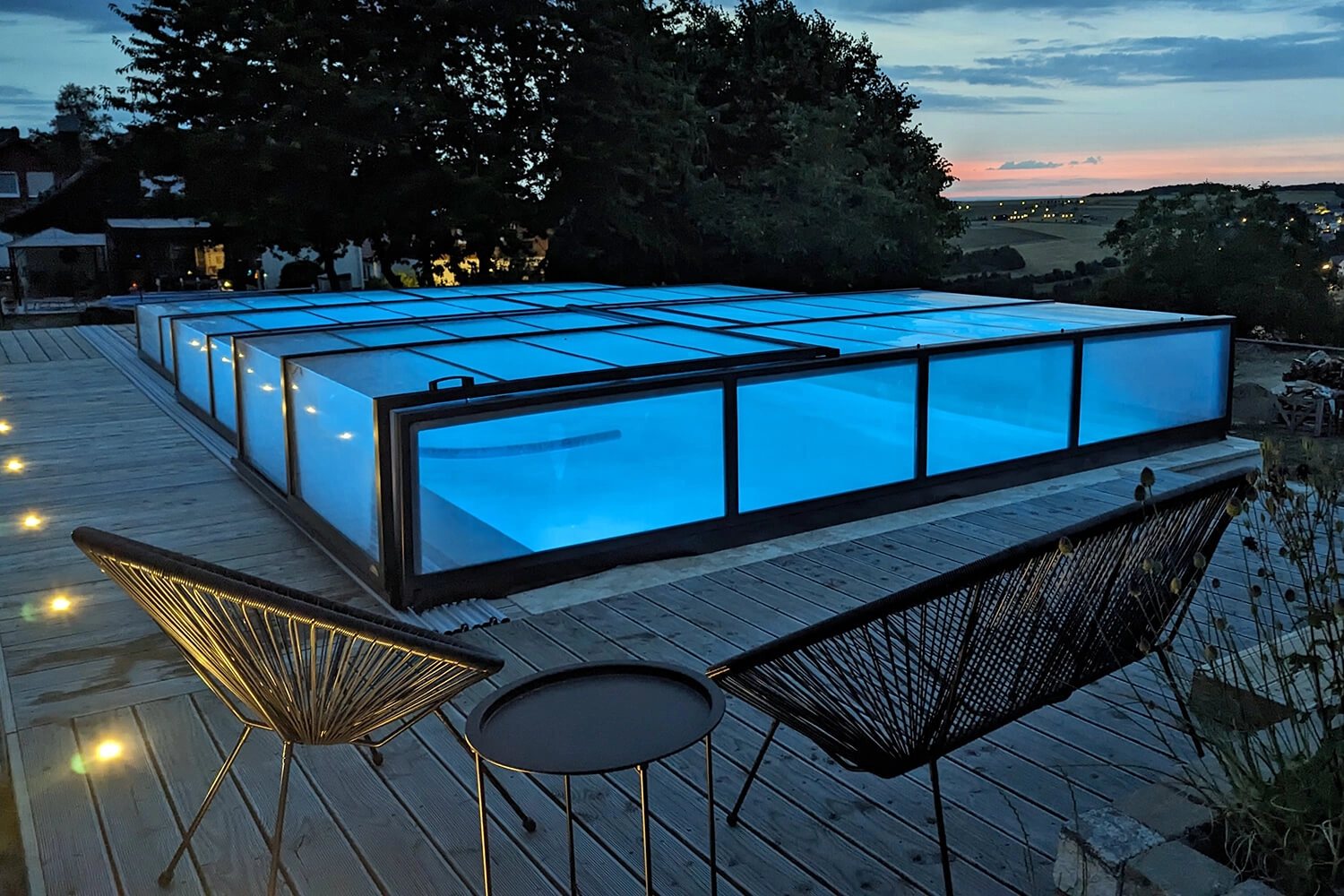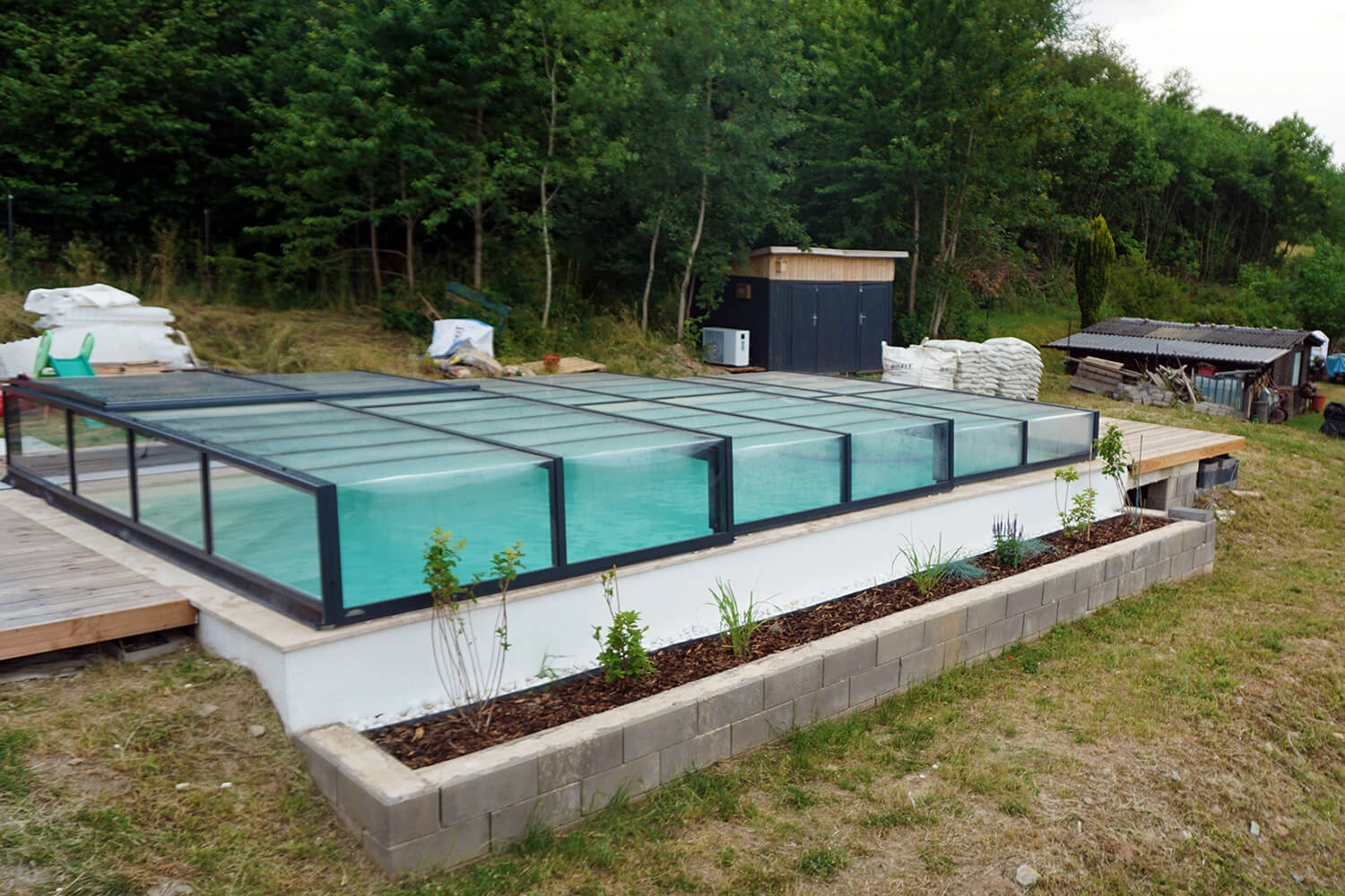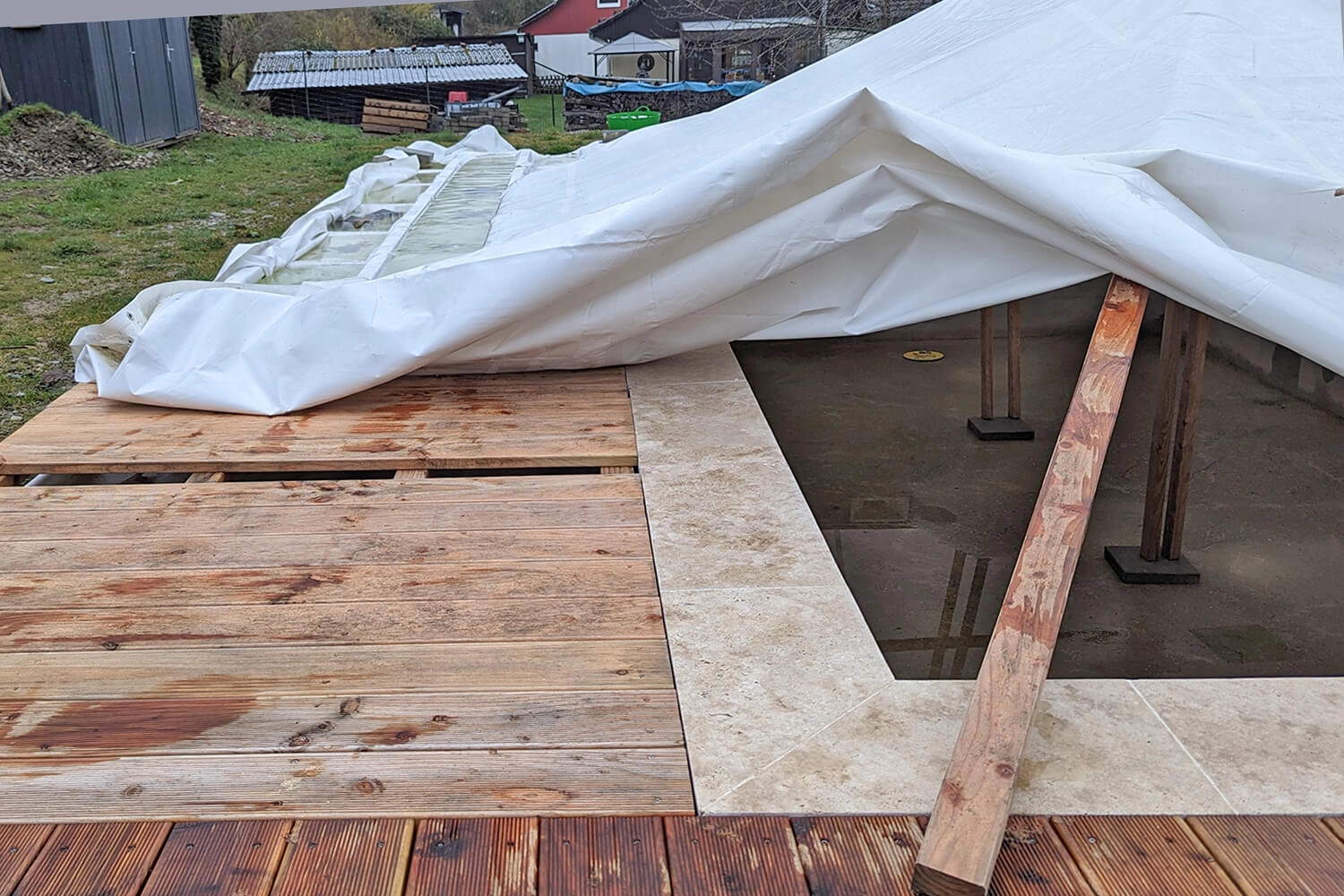 Scheinwerfer, Salzanlage mit PH und Wärmepumpe waren von Anfang klar. Leider hatte Apoolco kein passendes Dach für uns.