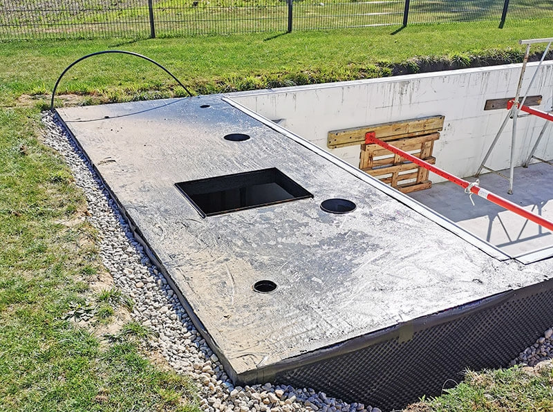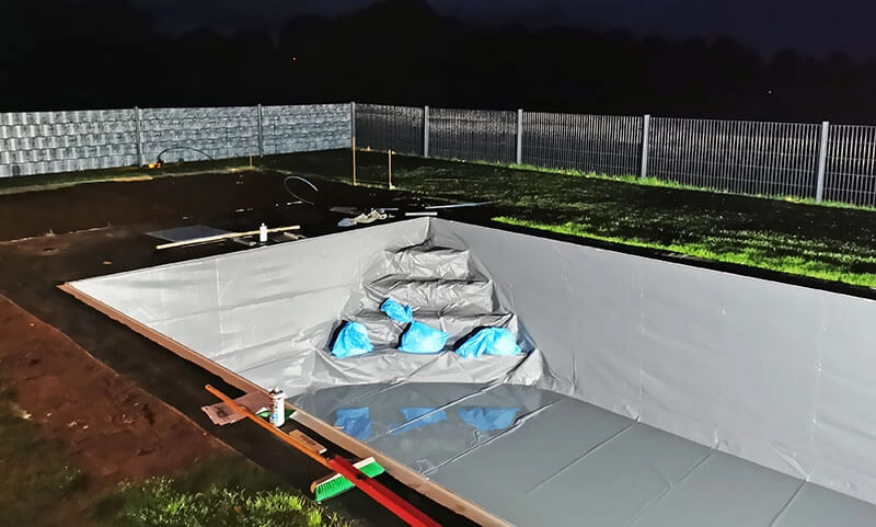 Die Verrohrung und Einbau der Technik, die Ecken der Folie dicht zu bekommen.