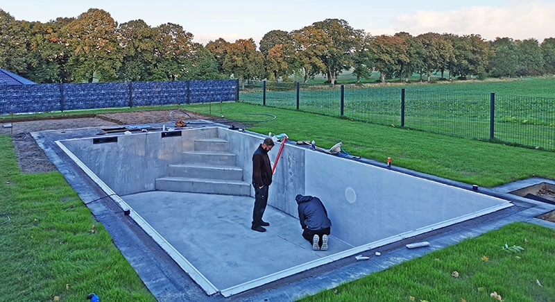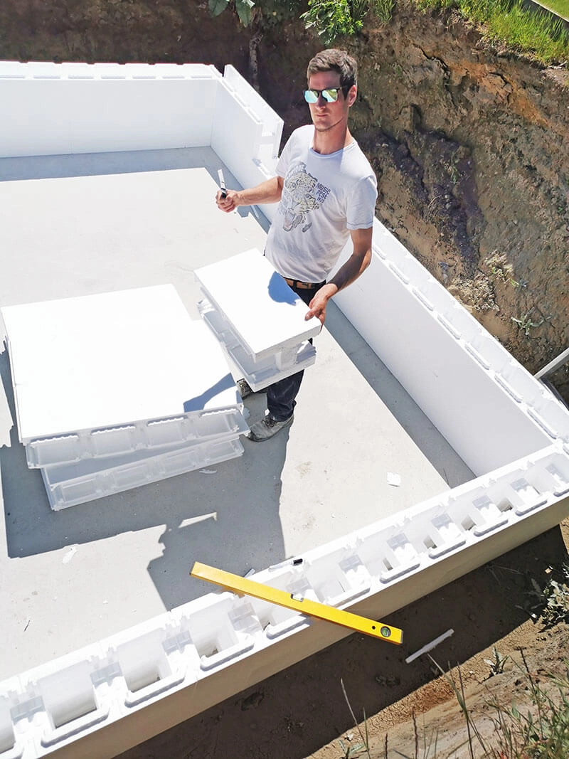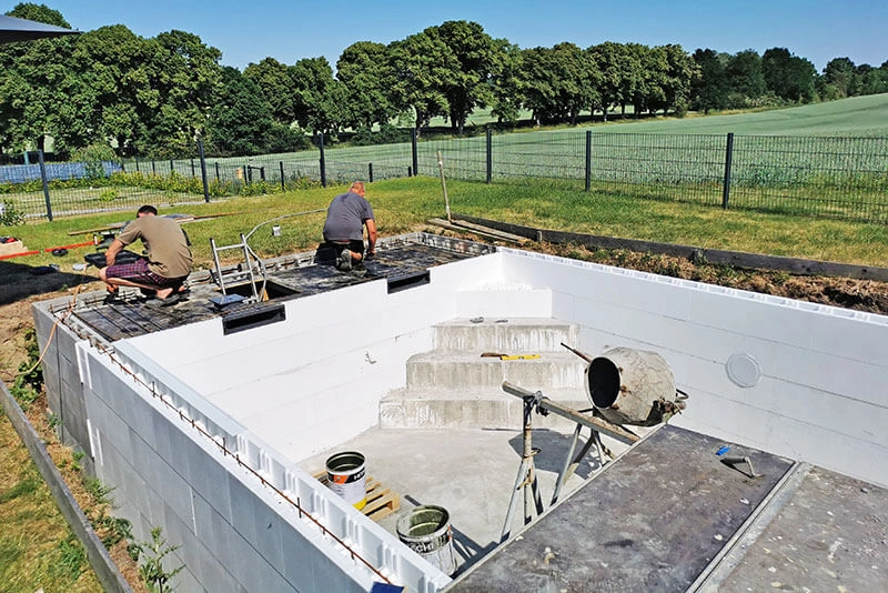 Es gab zwei Poolparties bei 31 Grad ohne Wasser, aber mit jeder Menge Spaß beim Befüllen der Styroporsteine mit Beton im Akkord an mehreren Mischern. Und bald gibt es eine große Gartenparty.