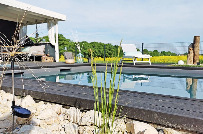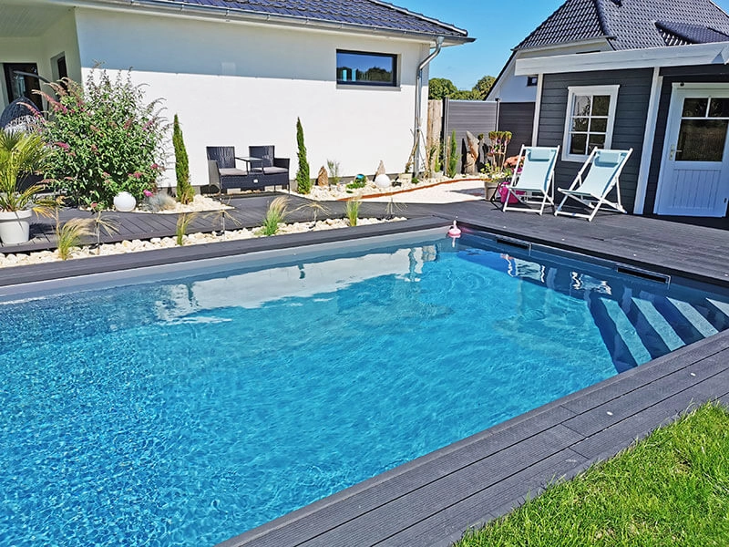 dunkelgrau Ein wunderbares Farbenspiel mit viel Modernität. Von adriablau bis schwimmteichfarbend je nach Sonnenstand. Wassertemperatur wird gut gehalten und war schnell über 20 Grad.