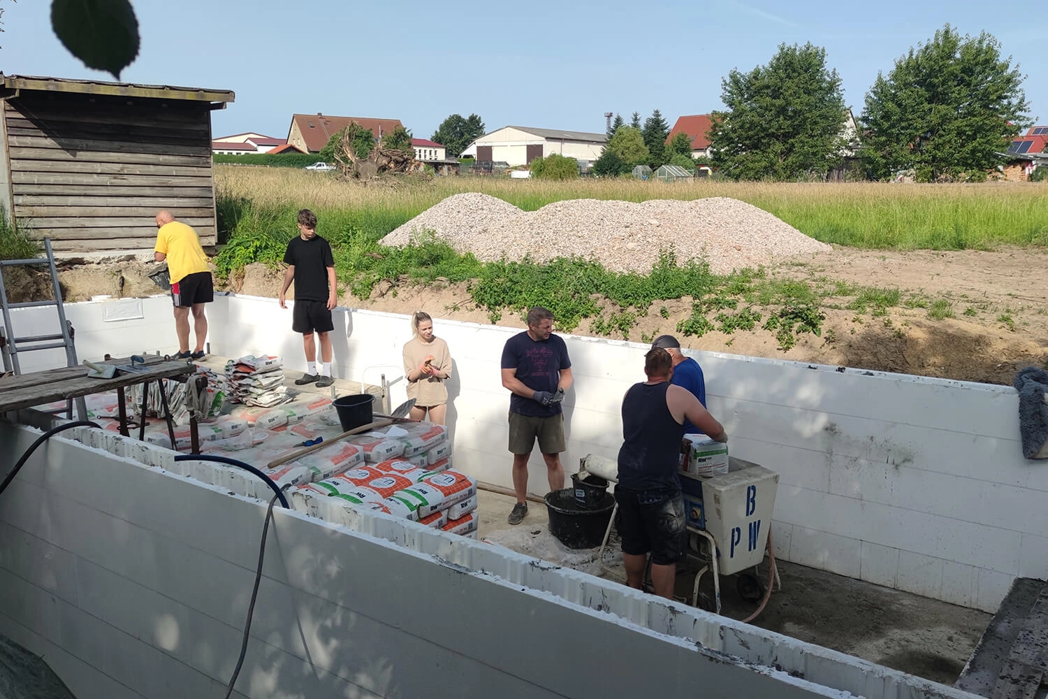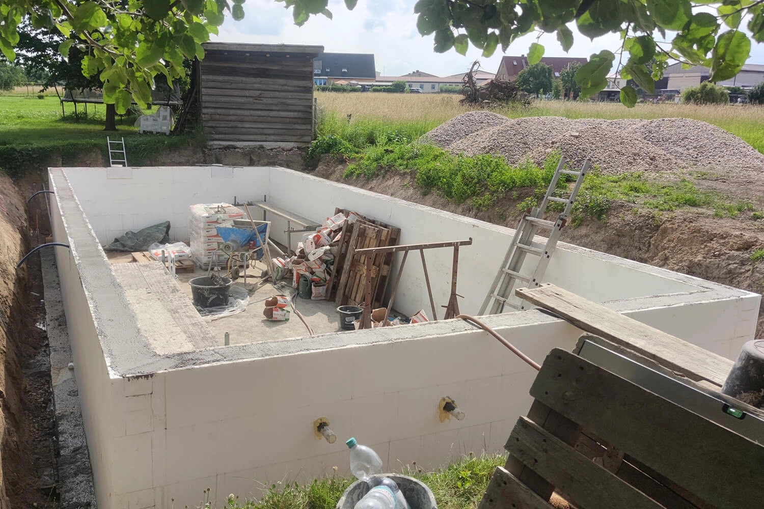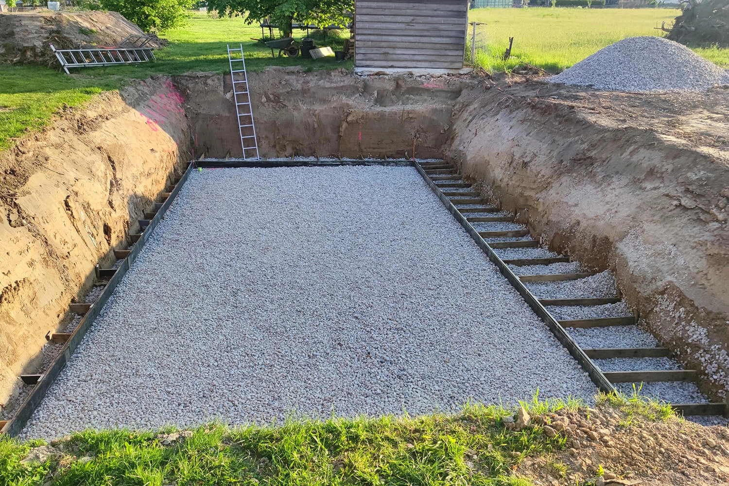 Aushub, Rollkies, Beton u Stahl für Bodenplatte und Poolwände, Spachtel für Wände, Radlader fürs Befüllen, Luftmatratzen