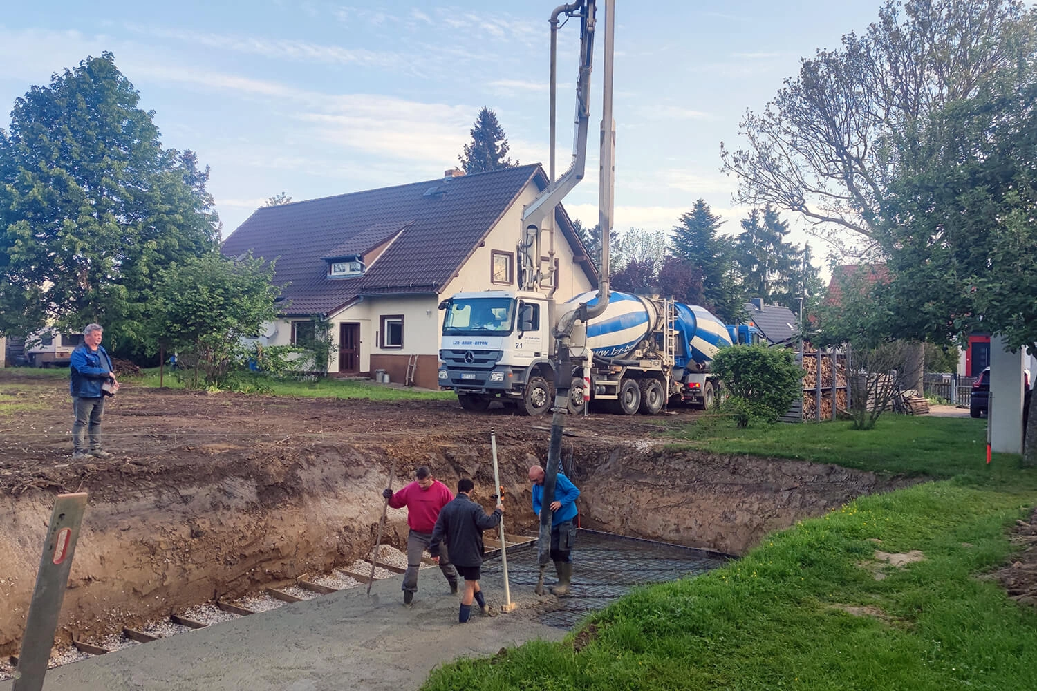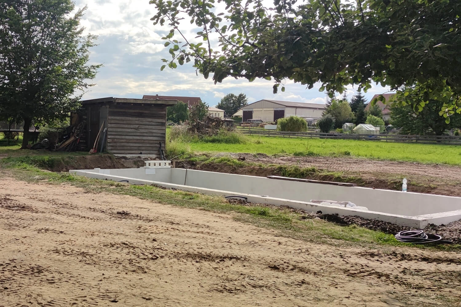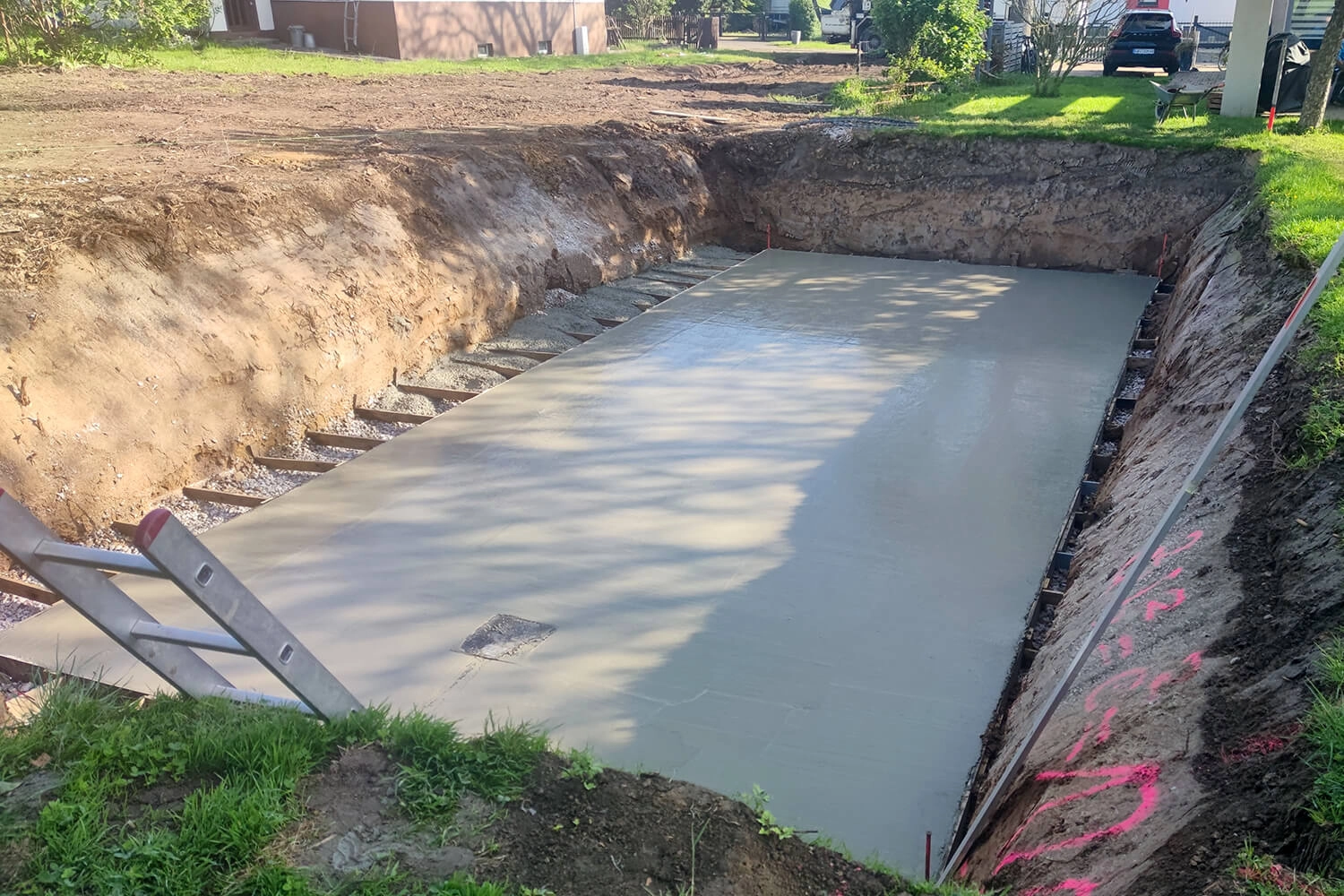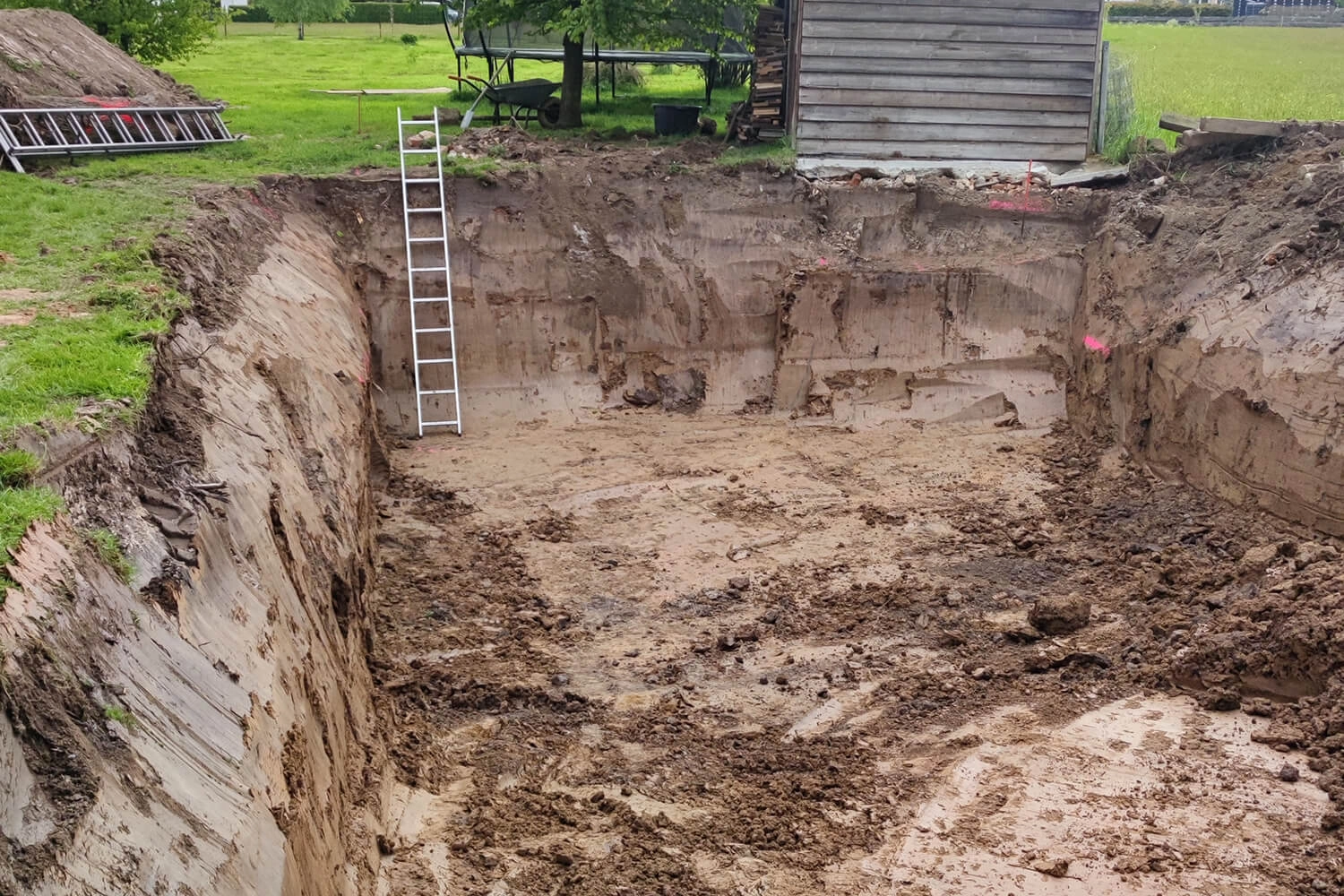 Aushub, Rollkies, Beton u Stahl für Bodenplatte und Poolwände, Spachtel für Wände, Radlader fürs Befüllen, Luftmatratzen