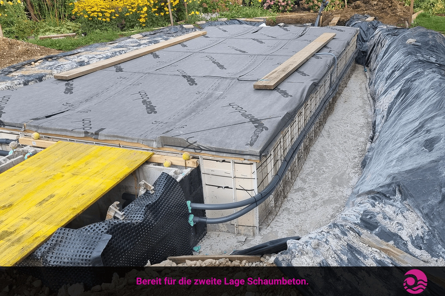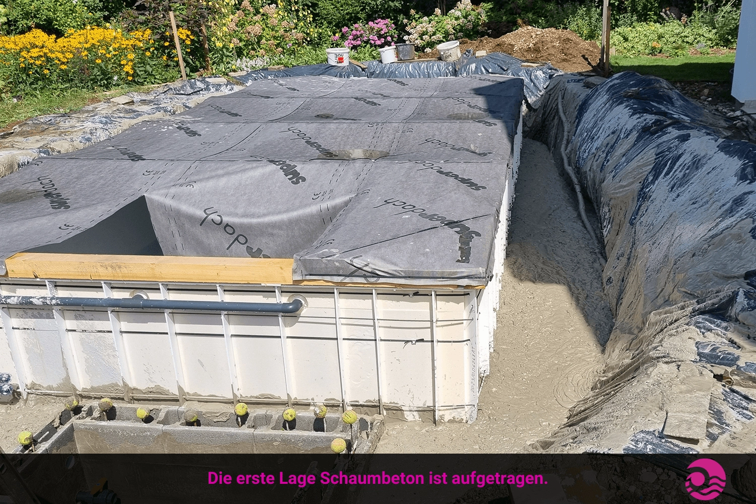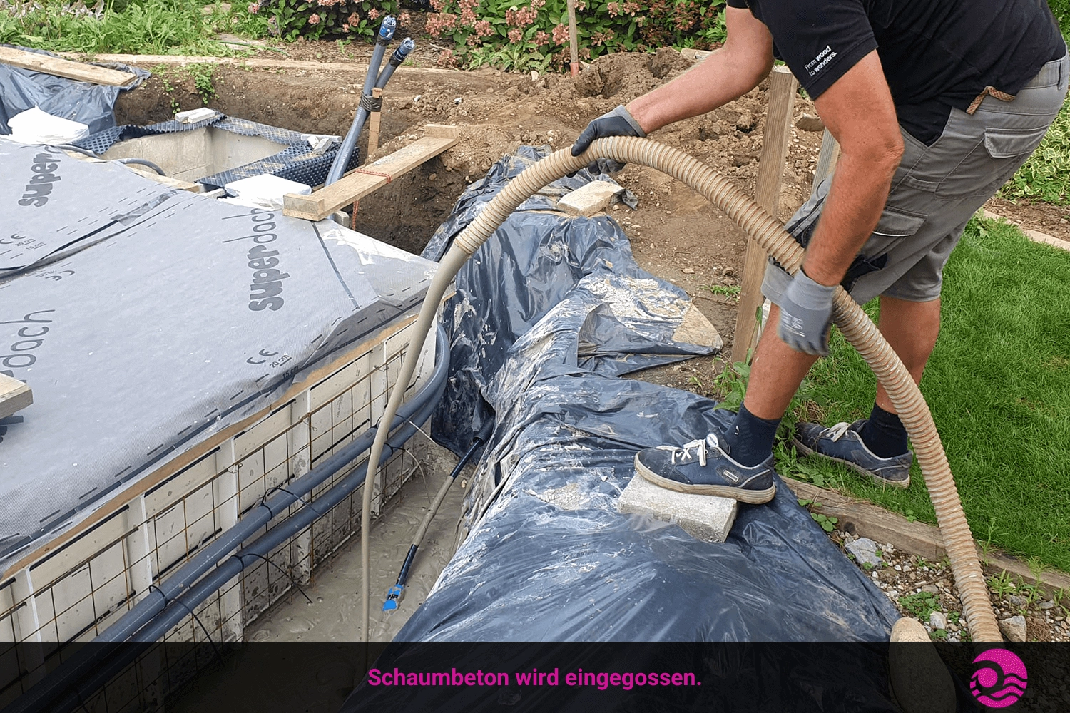 Nachdem die Baugrube wegen der unstabilen Bodenbeschaffenheit (Erde und Schotter) recht groß ausgehoben werden mußte, hat mir die Hinterfüllung mit Drainbeton echtes Kopfzerbrechen bereitet. Die Lösung war Schaumbeton POR 9040 von RÖFIX ! In 2 Lagen zu je 60cm wurde die Hinterfüllung im Abstand von einer Woche eingegossen. Die ganze Prozedur hat nur etwa eine Stunde gedauert. Das ausgehärtete Material ist in etwa mit YTONG vergleichbar, und bietet eine ideale Isolation für unser Becken