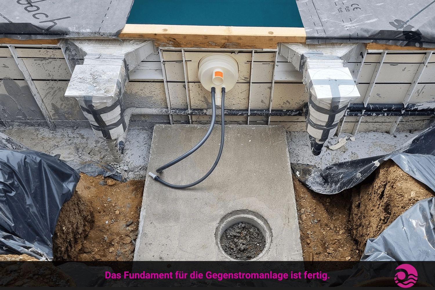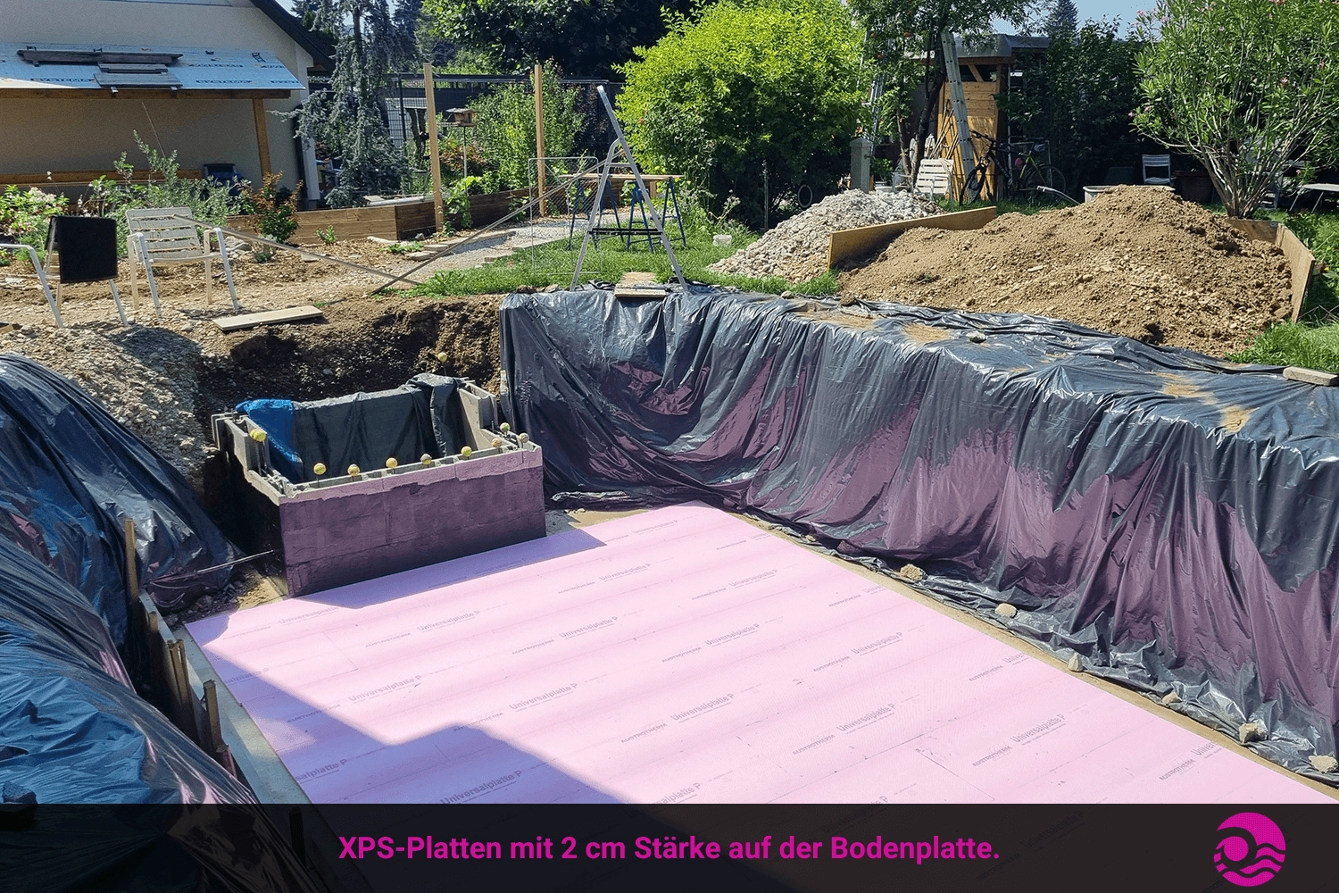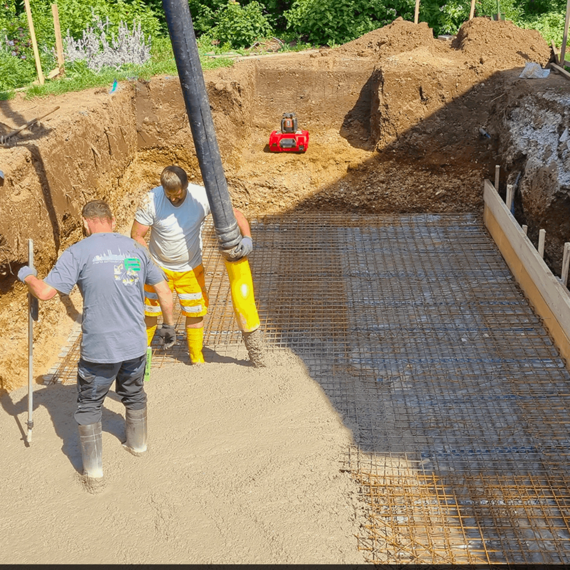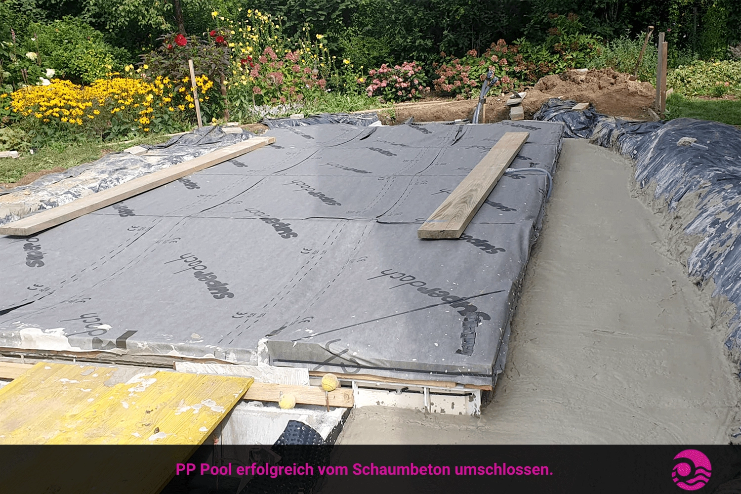 Nachdem die Baugrube wegen der unstabilen Bodenbeschaffenheit (Erde und Schotter) recht groß ausgehoben werden mußte, hat mir die Hinterfüllung mit Drainbeton echtes Kopfzerbrechen bereitet. Die Lösung war Schaumbeton POR 9040 von RÖFIX ! In 2 Lagen zu je 60cm wurde die Hinterfüllung im Abstand von einer Woche eingegossen. Die ganze Prozedur hat nur etwa eine Stunde gedauert. Das ausgehärtete Material ist in etwa mit YTONG vergleichbar, und bietet eine ideale Isolation für unser Becken