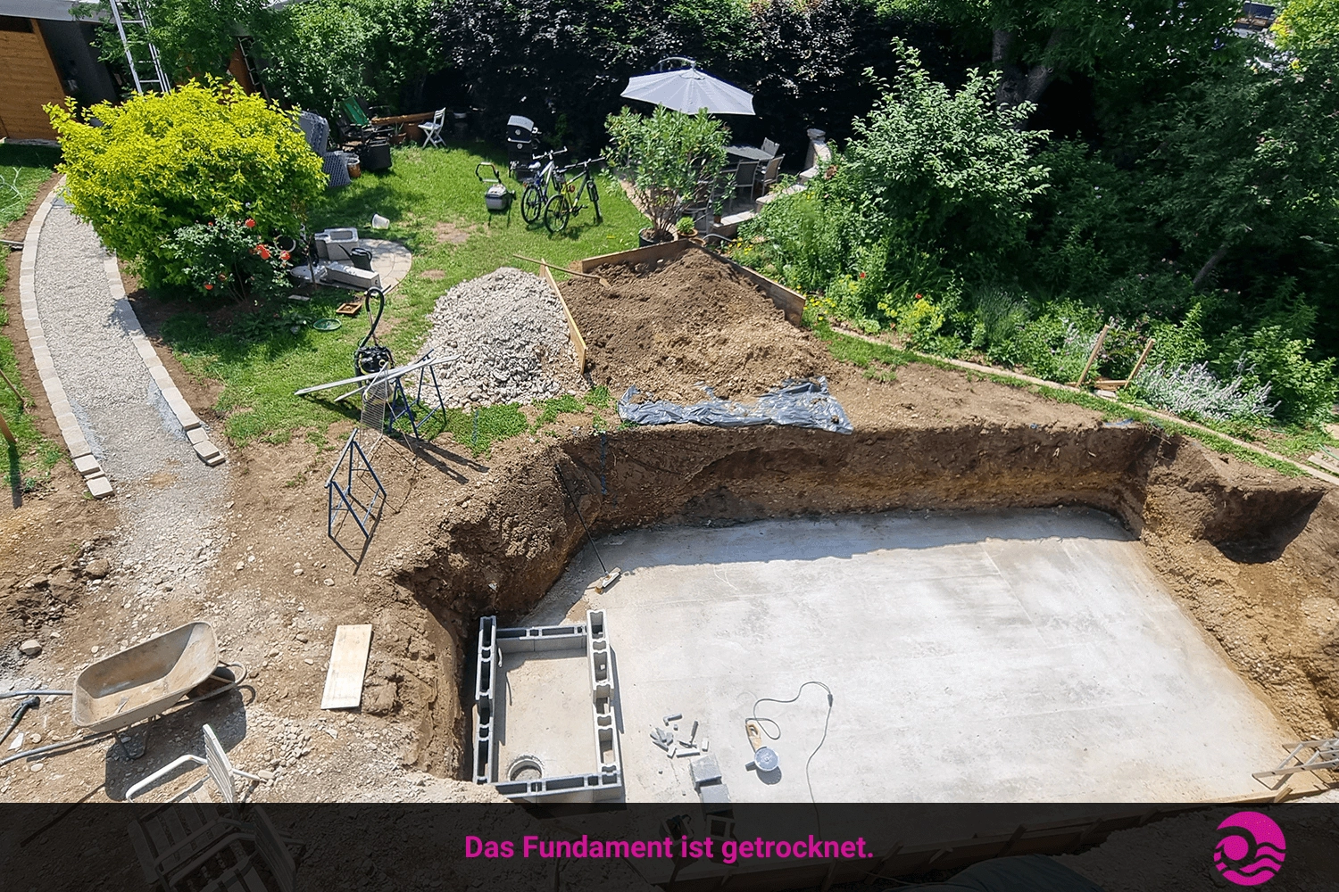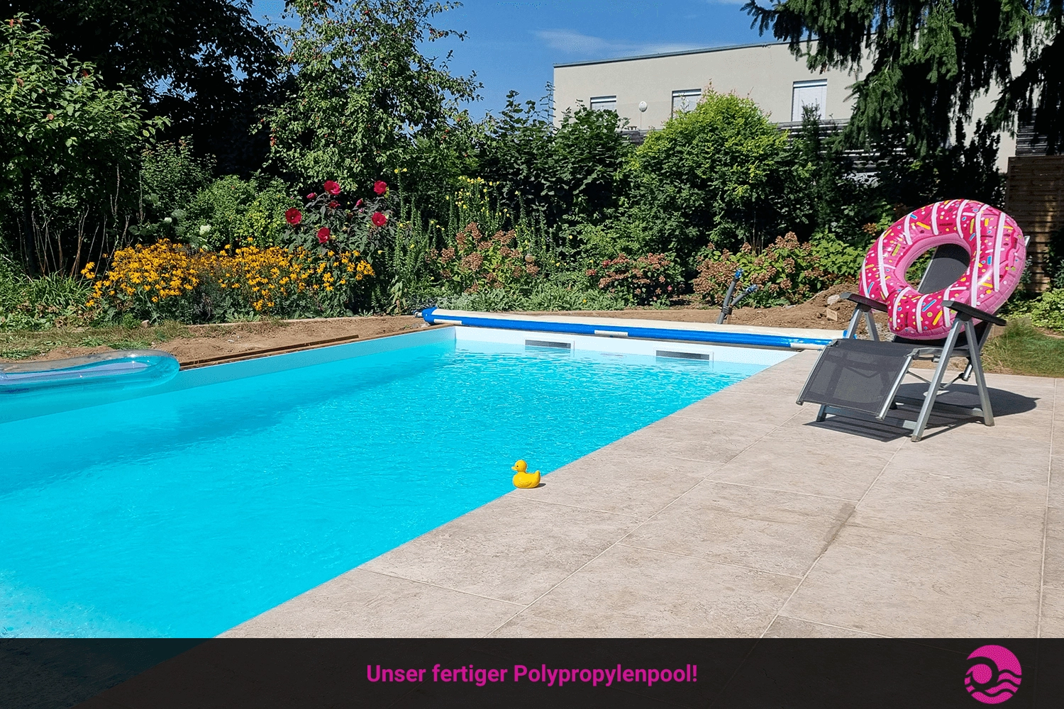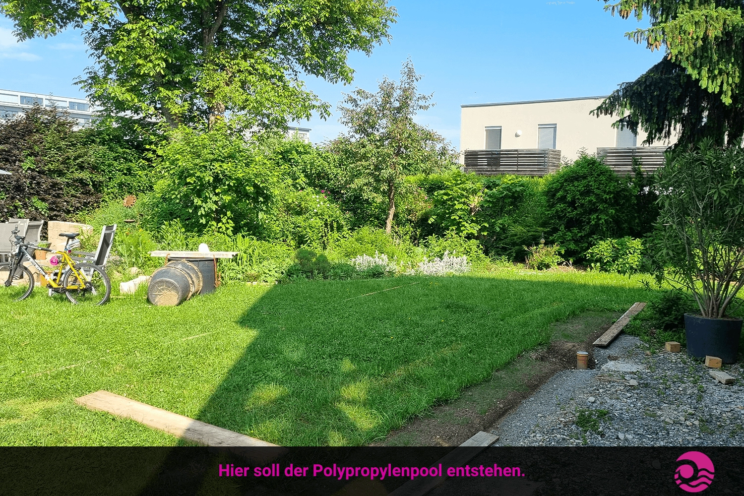 Wir sind begeisterte Wasserratten! Bei der Gartengestaltung standen wir vor der Entscheidung jetzt oder nie einen Pool zu bauen! Wenn die Gartenwege gepflastert und die Sträucher gepflanzt sind, wollten wir unseren Garten später nicht mehr mit schwerem Gerät umackern.