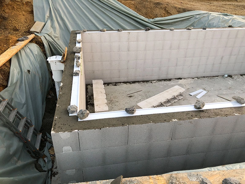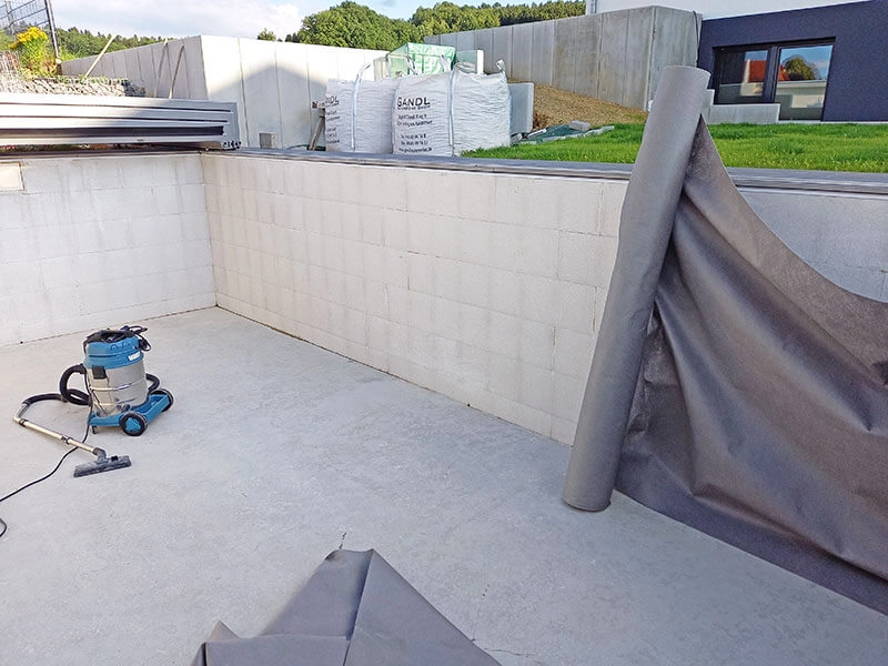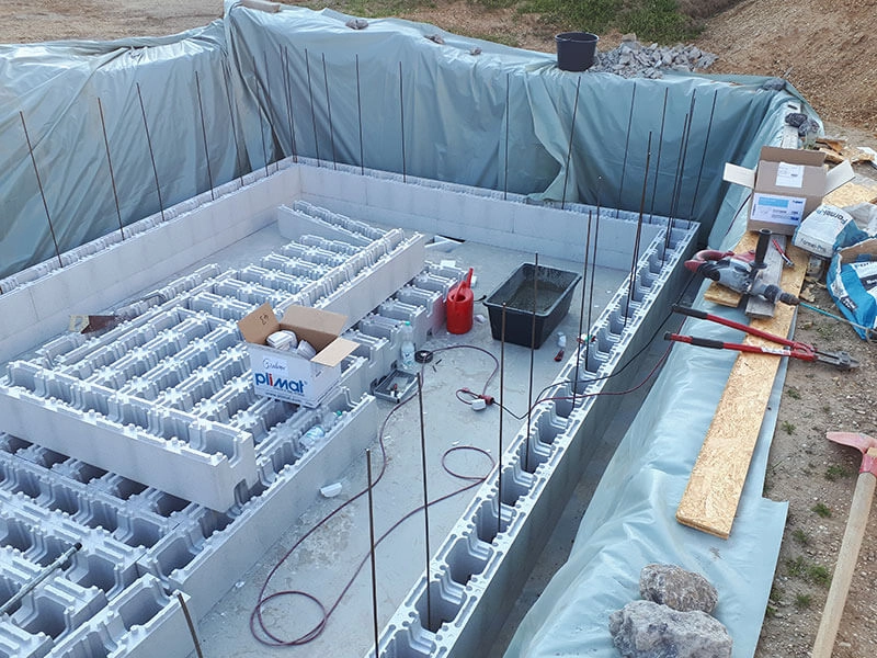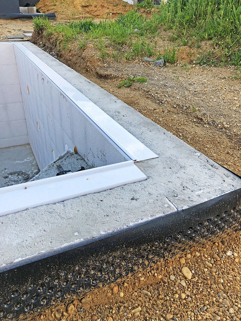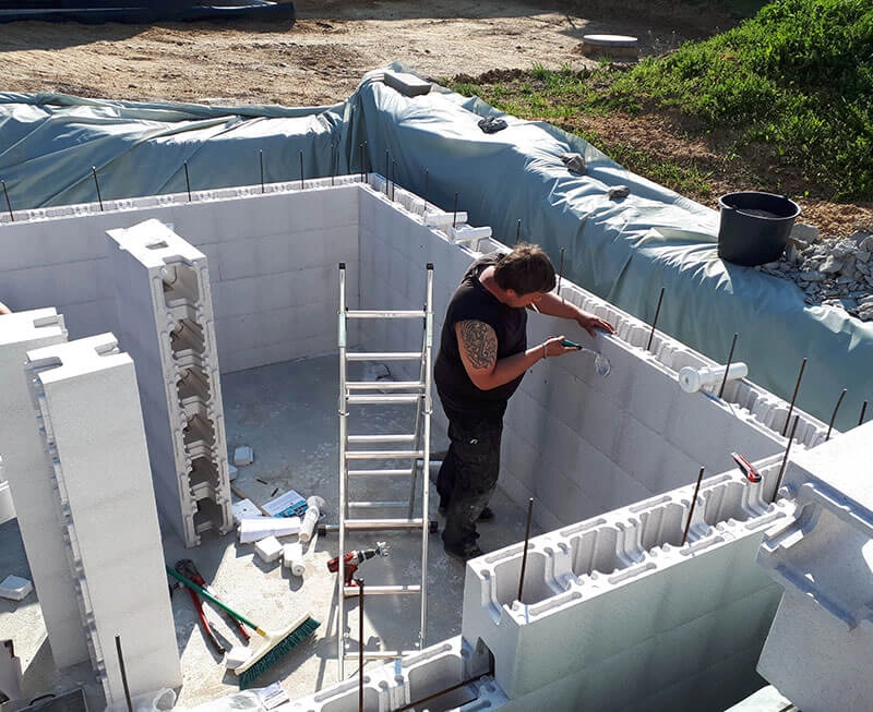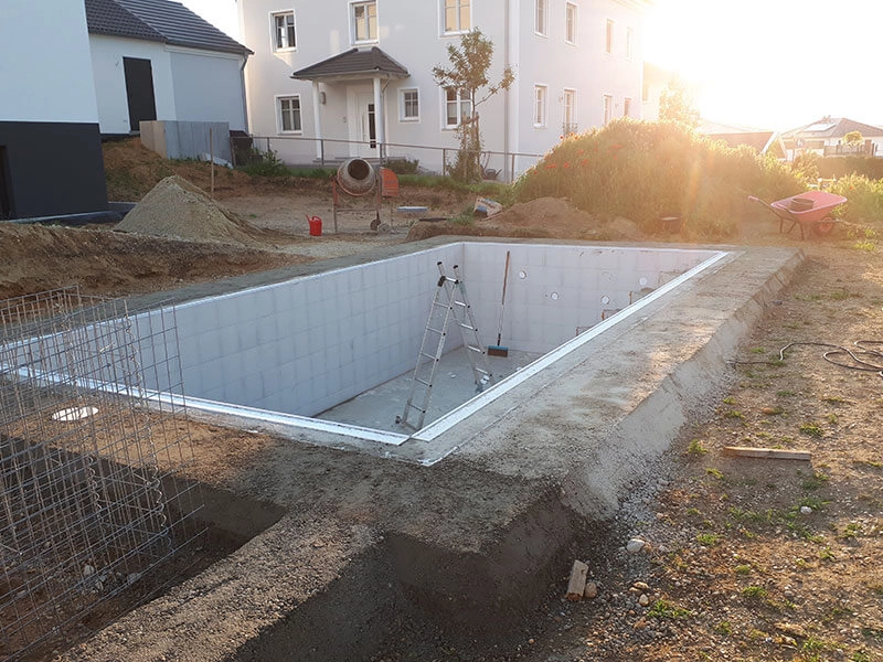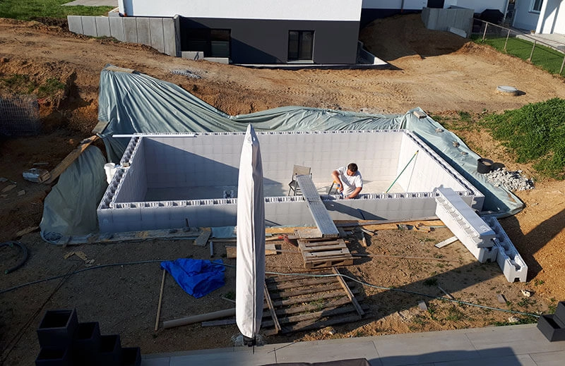 Das Aufeinandersetzen der Styroporsteine hat super funktioniert. Die waren sehr passgenau. Wir haben für die Wände die doppelte Menge an Eisenamierung verwendet als in der Mindestangabe beschrieben. Dadurch waren die Wände sehr stabil und wir haben uns das Ausspreizen beim Betonieren gespart. Das Einhängen der Schwimmbadfolie ging überraschenderweise auch recht gut.