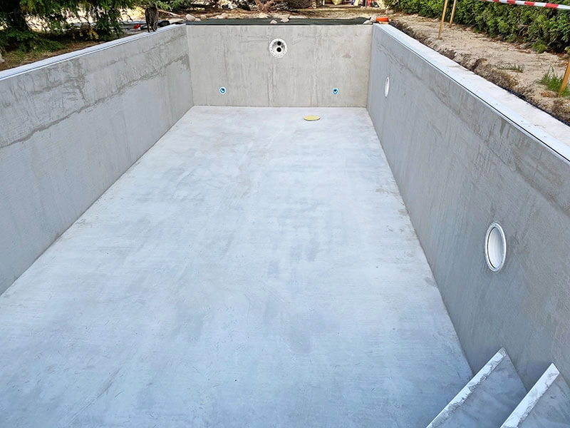 Da wir keinen normalen Skimmer-Pool, sondern einen High-Level-Pool (einseitige Überlaufrinne) gebaut haben, war hier der Aufwand sehr hoch. U.a. musste die Kante der Überlaufrinne mit einer Genauigkeit von +/- 2 mm realisiert werden Der Bau des Technikschachtes, die Installation der gesamten Verrohrung - Bypässe für Solarpaneel, Wärmepumpe, Elektrolyse und der Elektrik erforderten wesentlich mehr Zeit als erwartet. Die Pool-Umrandung war/ist ebenfalls sehr aufwendig, da für die Terrazzo-Platten solide Fundamente in dem Bereich geschaffen werden mussten, in dem sich vorher die Baugrube (jetzt unverdichtete Verfüllung) befindet.