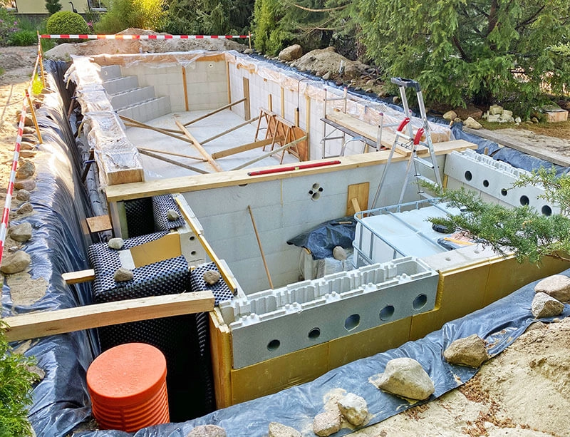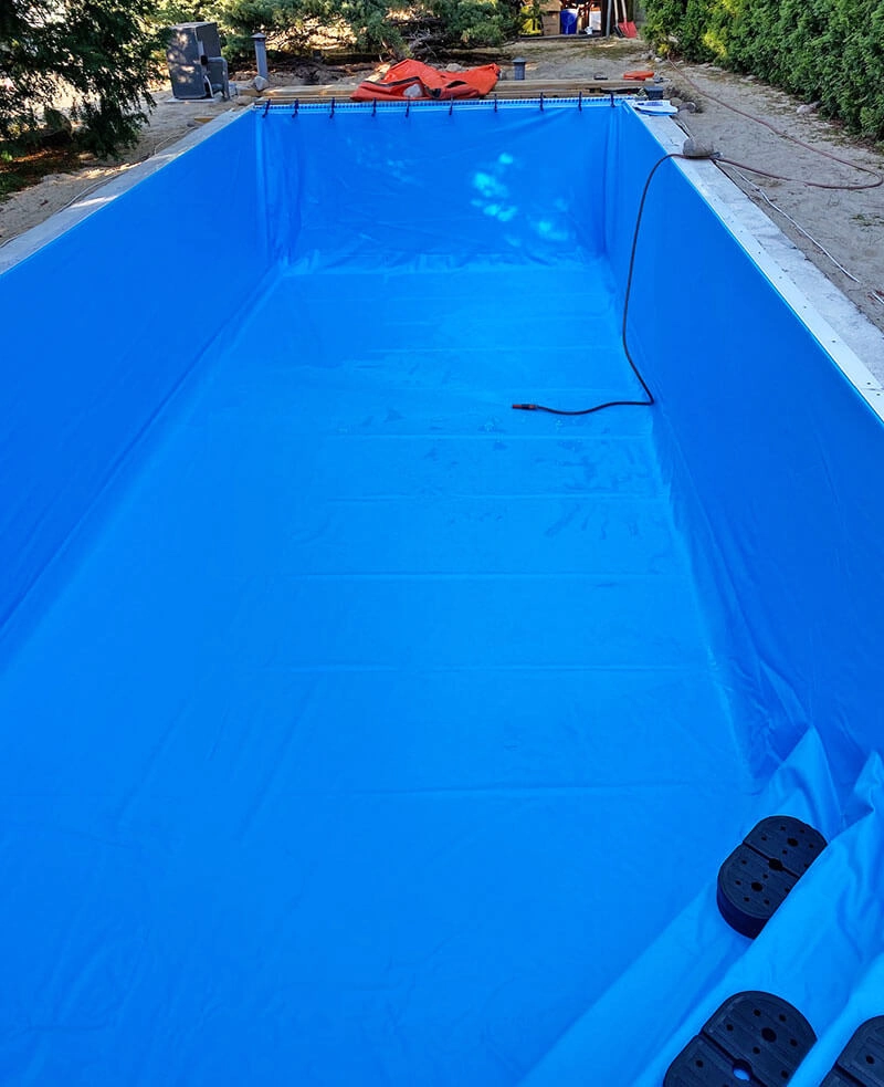 Wir hatten keinerlei Erfahrungen mit einem Poolbau. Der Aushub ging relativ schnell, unser märkischer Sandboden war wie ein großer Buddelkasten ... Das Aufeinandersetzen der Styroporsteine ging ziemlich flott, wobei es durchaus manchmal "Presspassungen" gab, da die BLOKIT-Steine schon mal etwas unterschiedlich in den Maßen waren (durch Feuchtigkeit etc.) Auch das Einhängen der Folie gestaltete sich einfacher als erwartet und ist zu zweit kein Problem. Wir waren sehr positiv überrascht wie toll sich die Folie an die Pool-Form angepasst hat, vor allem die Ecktreppe. Hut ab vor den Kollegen der Folien-Fertigung! Die empfohlene Vakuumierung mit einem Sauger mussten wir lediglich unterstützend an der Ecktreppe einsetzen. Das Vakuumierungs-Prinzip ist wohl eher notwendig, wenn man das Wasser mit einem Feuerwehrschlauch einlässt, d.h. wenn es sehr schnell geht ... bei uns hat es fast zwei Tage gedauert bis der Pool voll war.