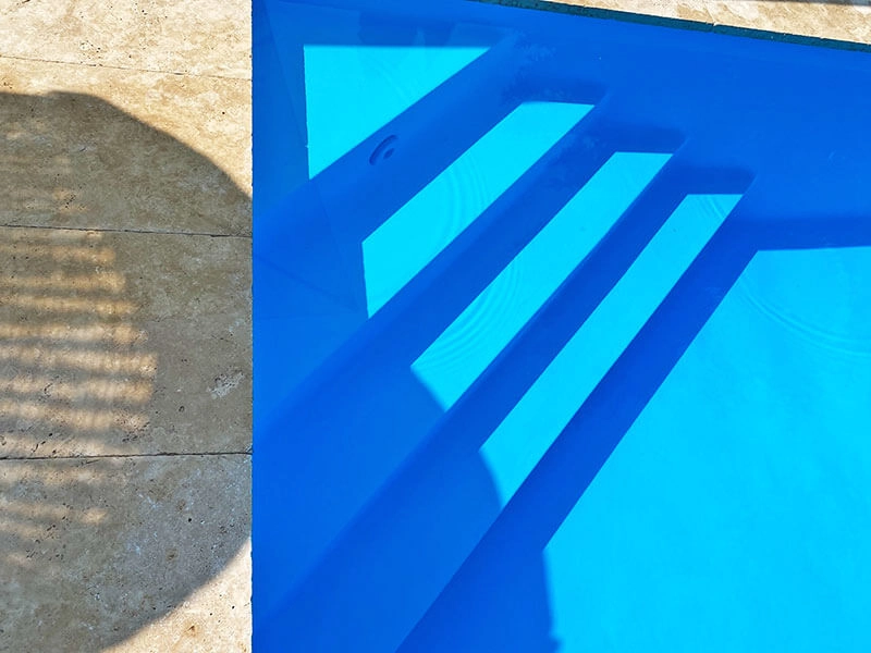 Blau - und das ist wunderschön - Danke an Apoolco! Wir würden dieses Blau immer wieder nehmen, auch abends bei eingeschalteten Unterwasser-Scheinwerfern sieht der blaue Pool umwerfend aus.