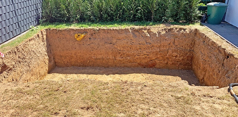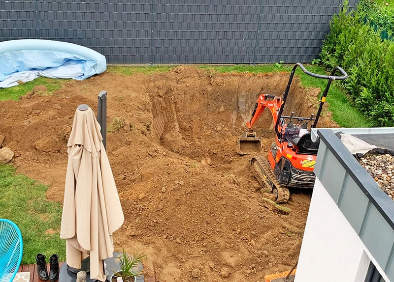 Den Aushub der Baugrube haben wir extern vergeben. Hier haben wir, als auch das durchführende Unternehmen, weniger Zeit und Arbeit kalkuliert. Der gesamte Aushub musste per Hand abgefahren werden. Somit ist der Aushub der schwierigste Teil gewesen.