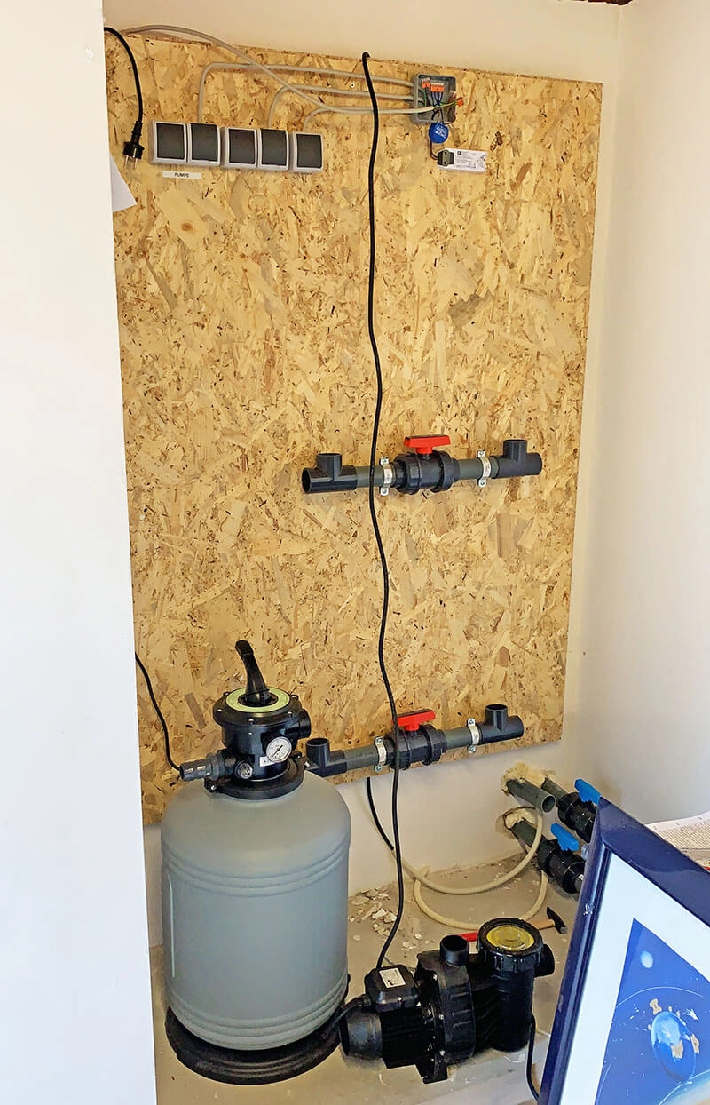 Wir haben folgende Extras dazugekaut: BWT LED RGB Scheinwerfer Blue Lagoon UV-C 40 Watt UV Desinfizierung Fairland 13kW Full Inverter Wärmepumpe Poolroboter Was in Zukunft noch folgt: pH Steuerung Salzelektrolyse Die Pooltechnik ist in der Garage.