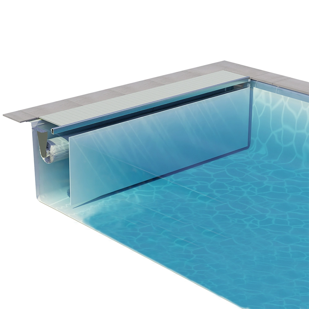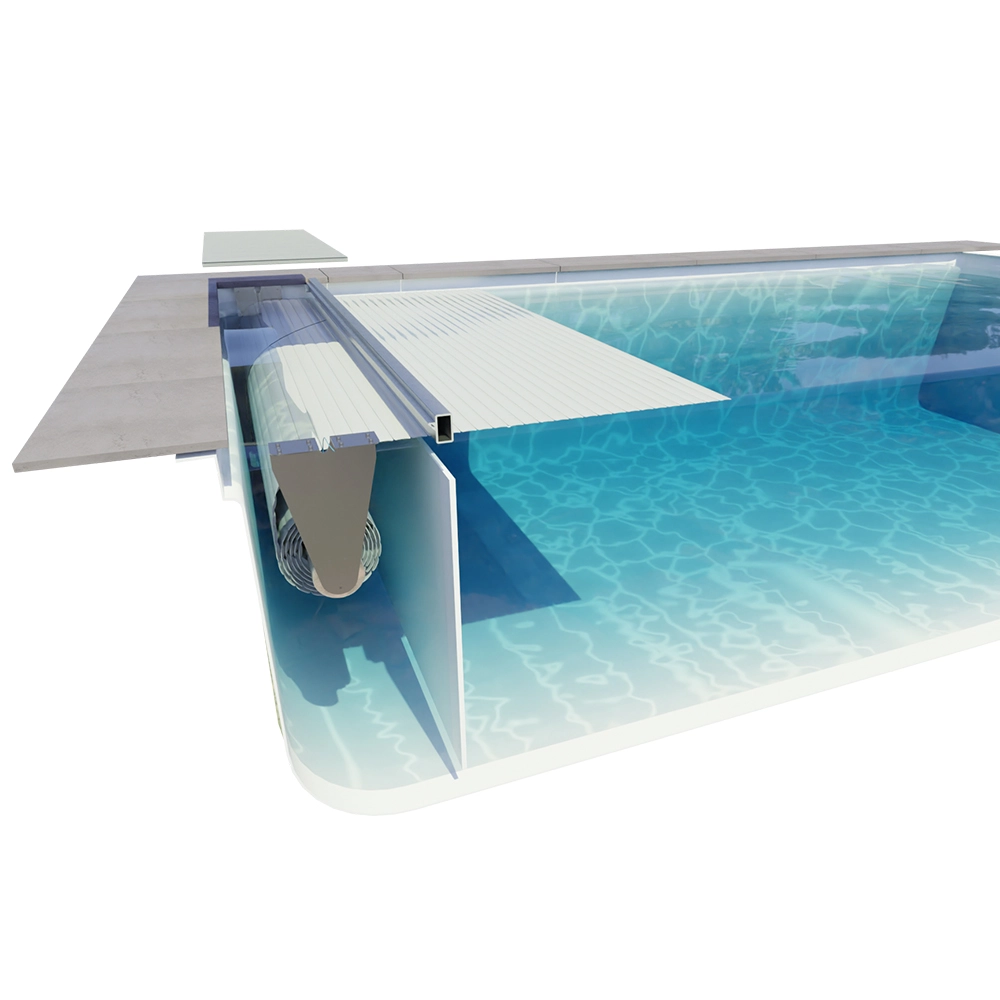 Diese Unterflur-Rollladenabdeckung sorgt für einen saubereren, sichereren und optimal temperierten Pool. Sie wird in einer separaten Nische im Pool installiert, die durch eine PVC-Trennwand vom Becken abgegrenzt ist. In dieser Nische befindet sich der komplette Antriebsmechanismus, der fast unsichtbar unter einem stabilen Gitterrost liegt und von einem Aluminiumträger getragen wird. Die Montage erfolgt dabei immer gegenüber der Treppen.