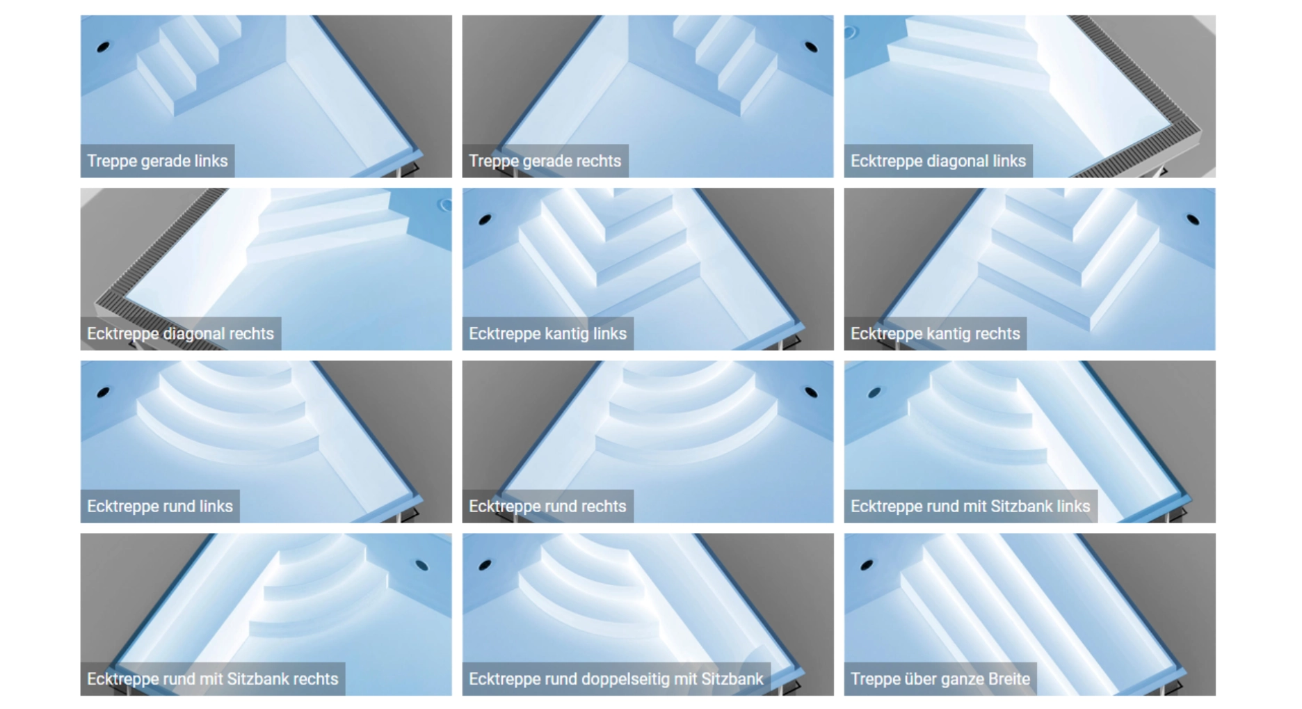 Die Standardtreppen sind aus dem gleichen Material wie die Poolwand mit der gleichen Stärke. Sie werden bei der Herstellung in den Pool montiert und im laufenden Poolbetrieb mit Wasser mit einer Einlaufdüse unterspült und stabilisiert.