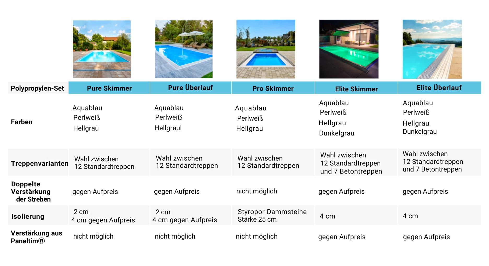 Polypropylen Pools gibt es in verschiedenen Größen, Formen und Designs und können an die individuellen Bedürfnisse und Wünsche angepasst werden. Sie sind in der Regel auch resistent gegen UV-Strahlen und Chemikalien im Poolwasser, was zu einer längeren Haltbarkeit beiträgt.
