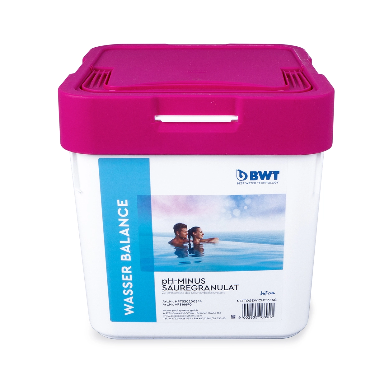 Mit dem BWT AQA Marin pH-Minus Granulat 7,5 kg kaufen Sie ein Qualitätsprodukt mit dem Sie ganz einfach den pH-Wert in Ihrem Becken senken. Verwendung findet die Poolchemie bei Werten die über 7,4 liegen.