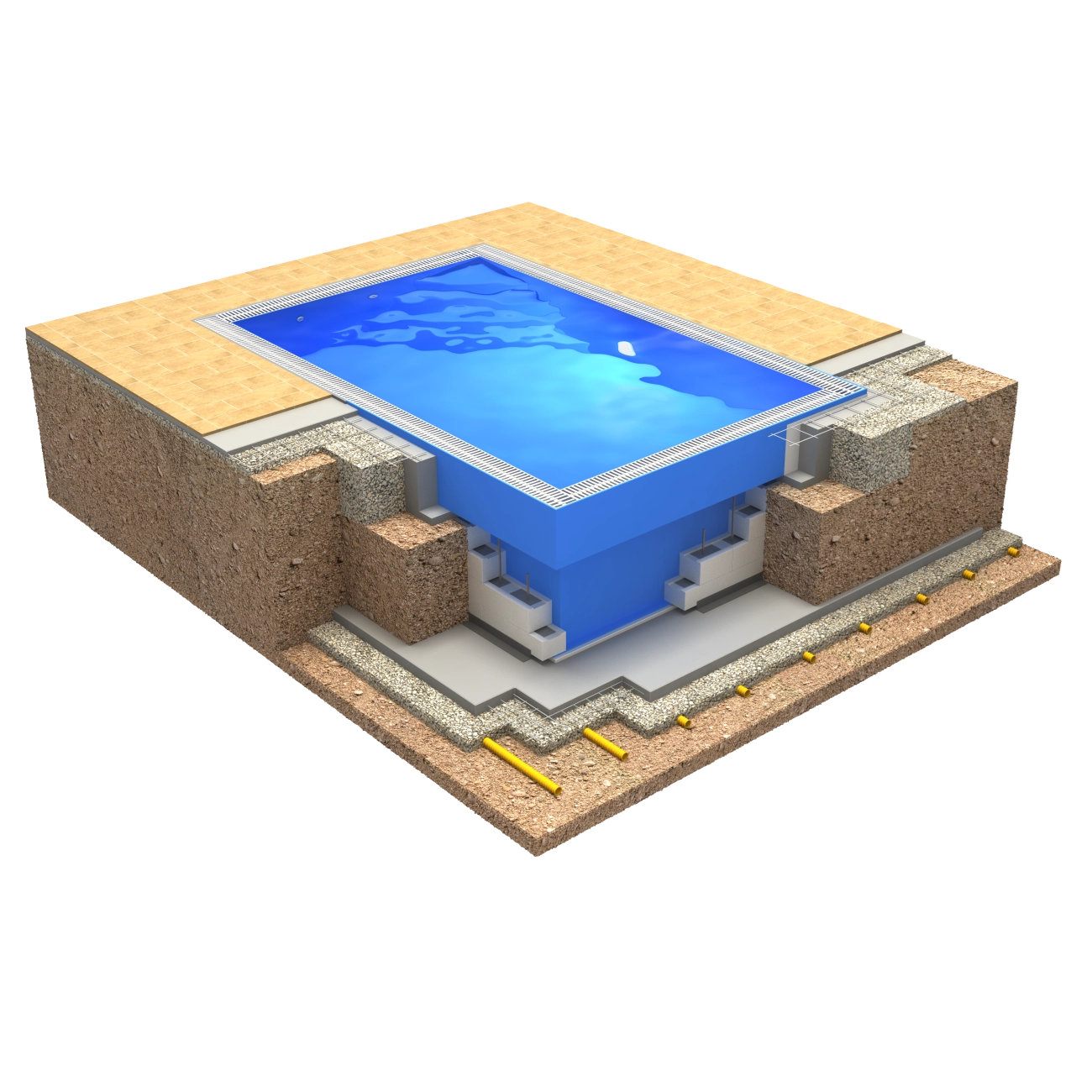 - Schwimmbeckenkörper einschließlich Rohrleitungen in Rohrdurchmesser 50mm, PN10 (geschützt in Thermokonstruktion)