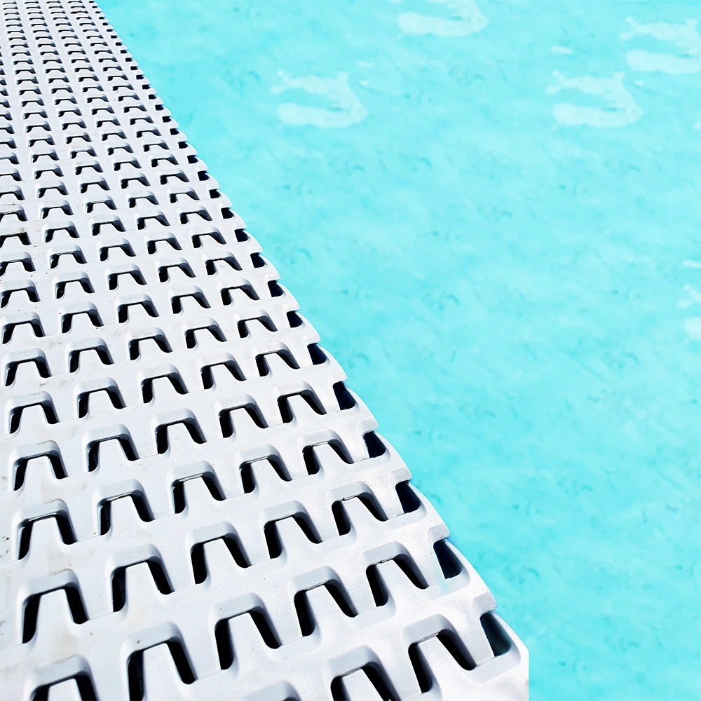 Das Überlaufgitter X-FLOW ist in grau und weiß erhältlich und wird als Variante bei den Überlaufpools angeboten. Seine Form begrenzt das Überlaufen von Wasser außerhalb der Rinne und reduziert so den Wasserverbrauch. Der Pool geht elegant ohne Höhenunterschied in das umliegende Gelände über.