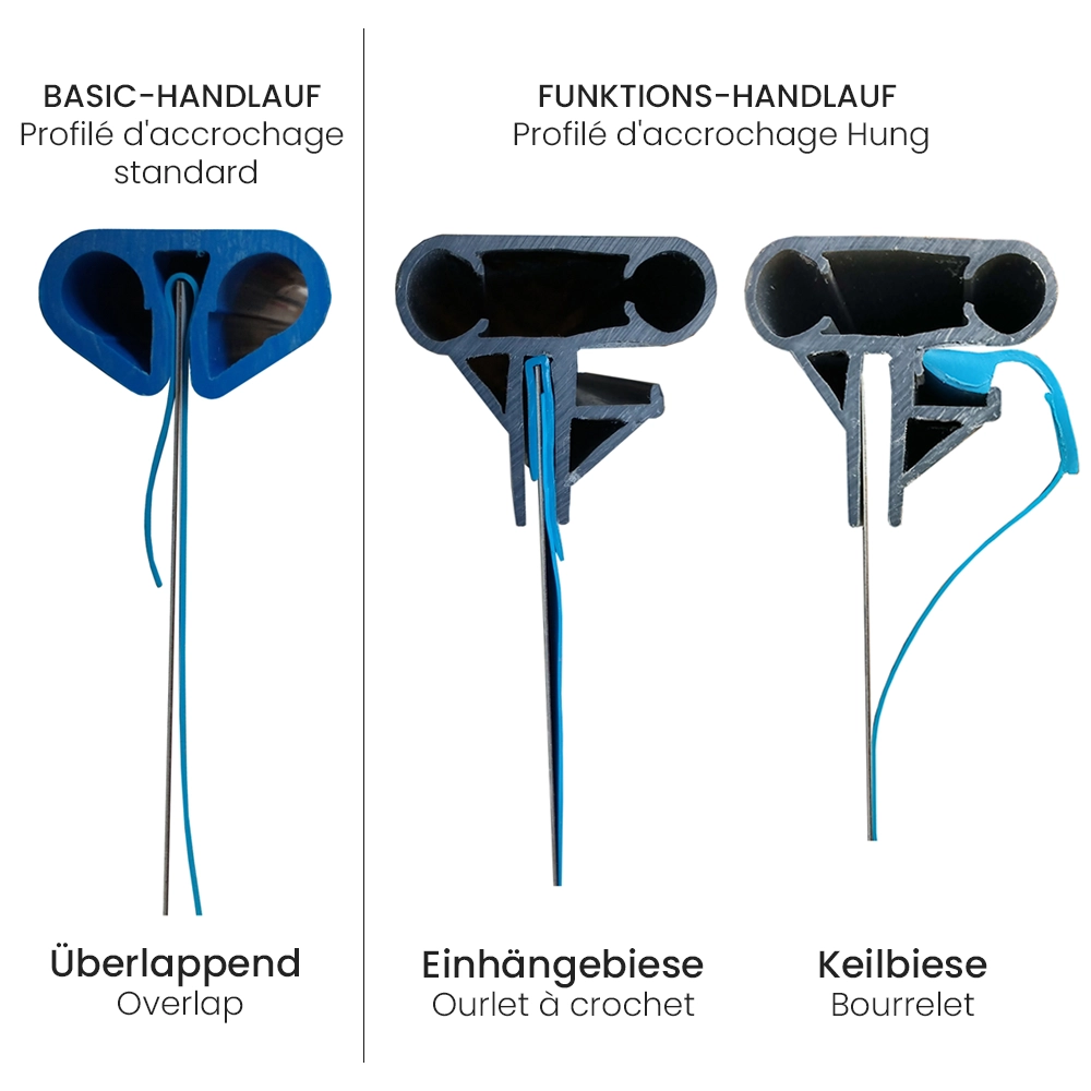 Bei Stahlwandpools unterscheiden wir zwischen drei gängigen Varianten zur Befestigung der Poolfolie – je nach Handlauf und Montagesituation: