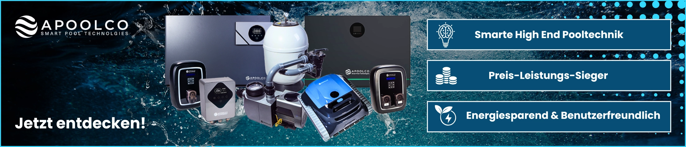 Verlassen Sie sich auf die Smarte Pooltechnik von Apoolco und machen Sie Ihren Pool smarter, nachhaltiger und komfortabler. Genießen Sie Ihre freie Zeit, während unsere Technologie für Sie arbeitet. Jetzt im Apoolco Online Shop bestellen!