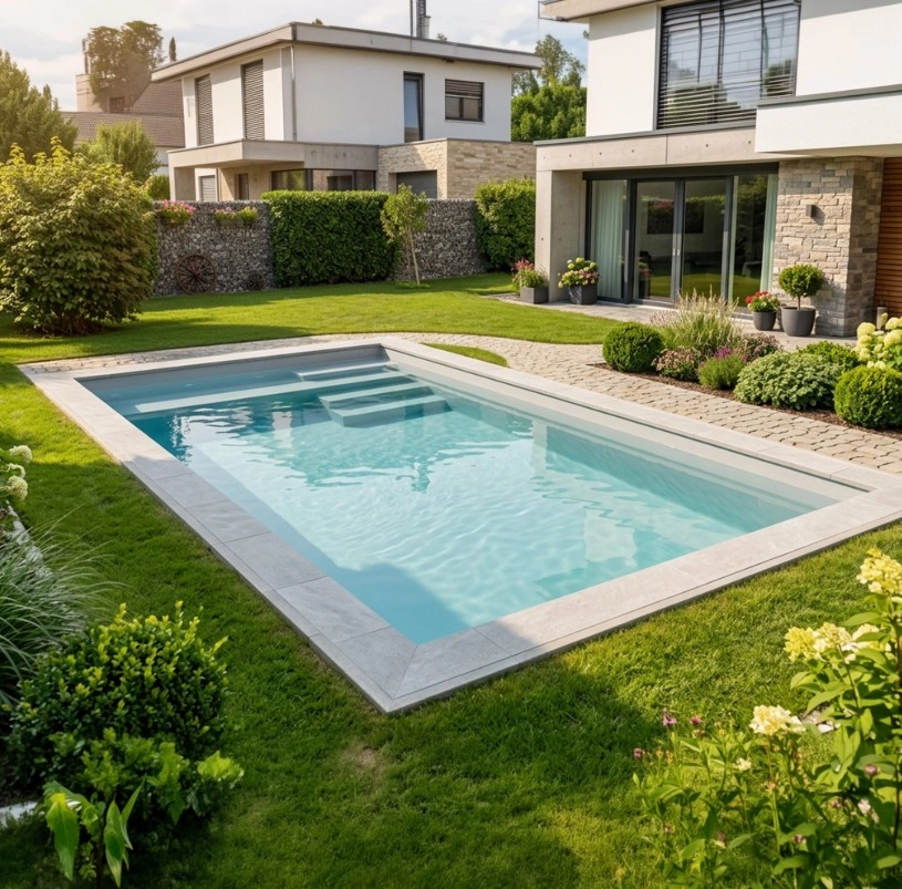 Familie P. aus Neuried Styroporpool mit Treppe und Sitzbank