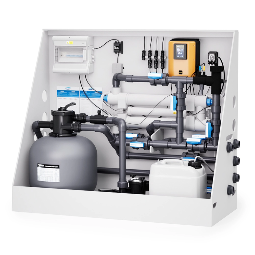 Dank der vollständig ausgestatteten Technikwände mit hochwertigen BRILIX®-Komponenten wird der Installationsaufwand minimiert. Alle elektrischen Zubehörteile sind bereits miteinander verbunden, sodass nur noch der Anschluss an den Pool und die Stromversorgung notwendig ist.